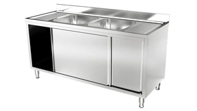 Deze professionele spoeltafel met schuifdeuren van Qusinox is opgebouwd uit stevige constructie.