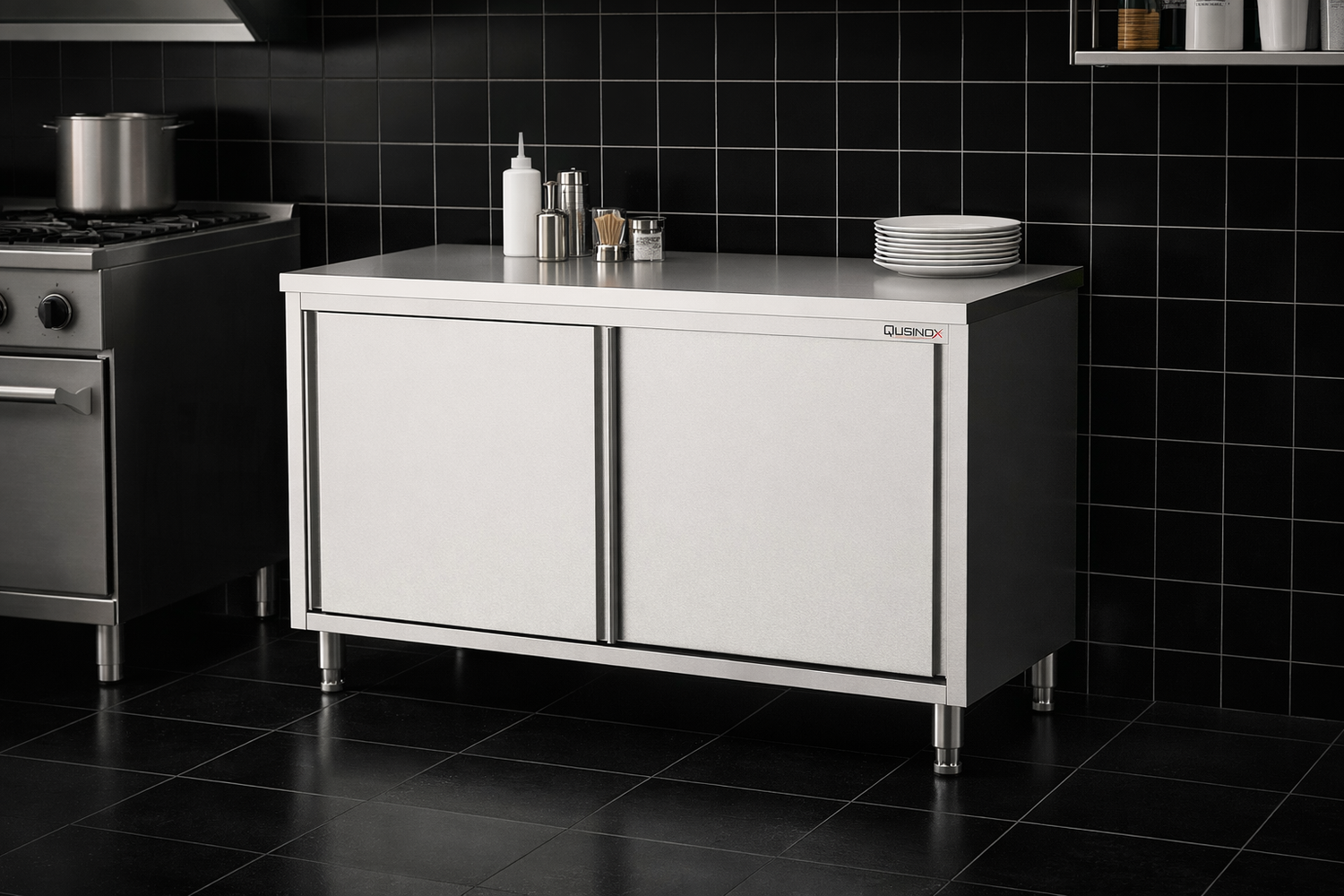 Professionele RVS werktafel met schuifdeuren van Qusinox, gemaakt van AISI 430 geborsteld RVS.